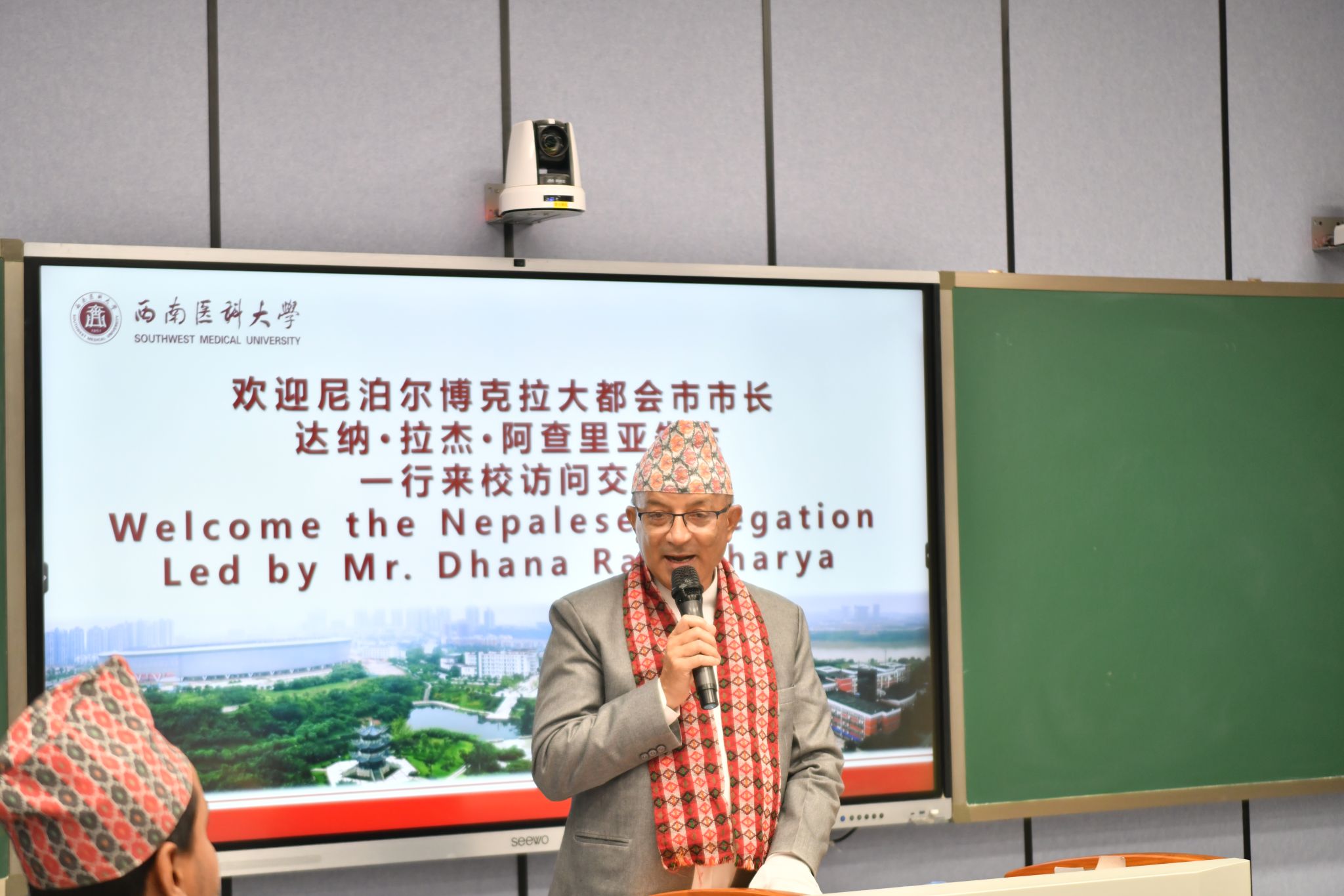 2025年3月20日,尼泊尔博克拉市市长达纳·拉杰·阿查里亚先生一行20人来国际教育学院访问并座谈交流。国际教育学院、国际合作交流处,尼泊尔籍学生参会,会议由国际教育学院院长陈勤主持。