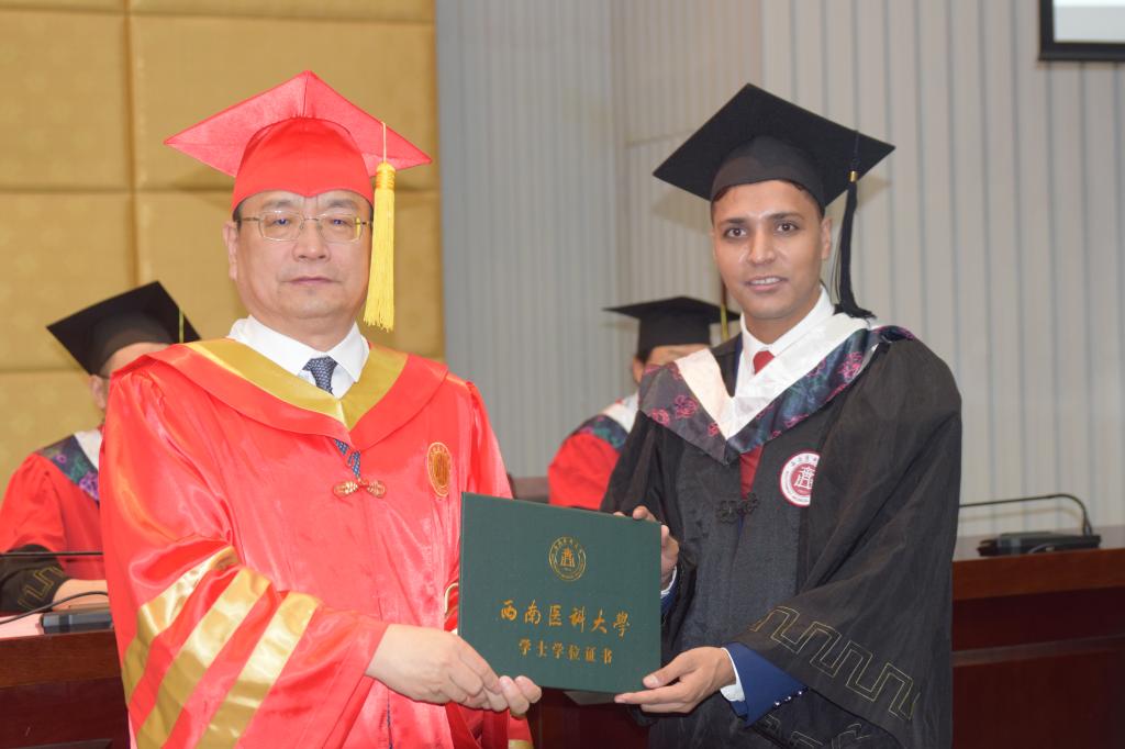 留学生教师代表黄成亮勉励学生们“不为良相,便为良医”,在今后的生活和工作中坚持善念,坚守医德。来华留学毕业生AMISHA MARY LYNGDOH代表全体留学生衷心感谢学校的栽培,感谢国际教育学院全体老师的帮助和指导,表示将继续讲好中国故事、传播中国好声音,为母国和中国的文化交流作出积极贡献。