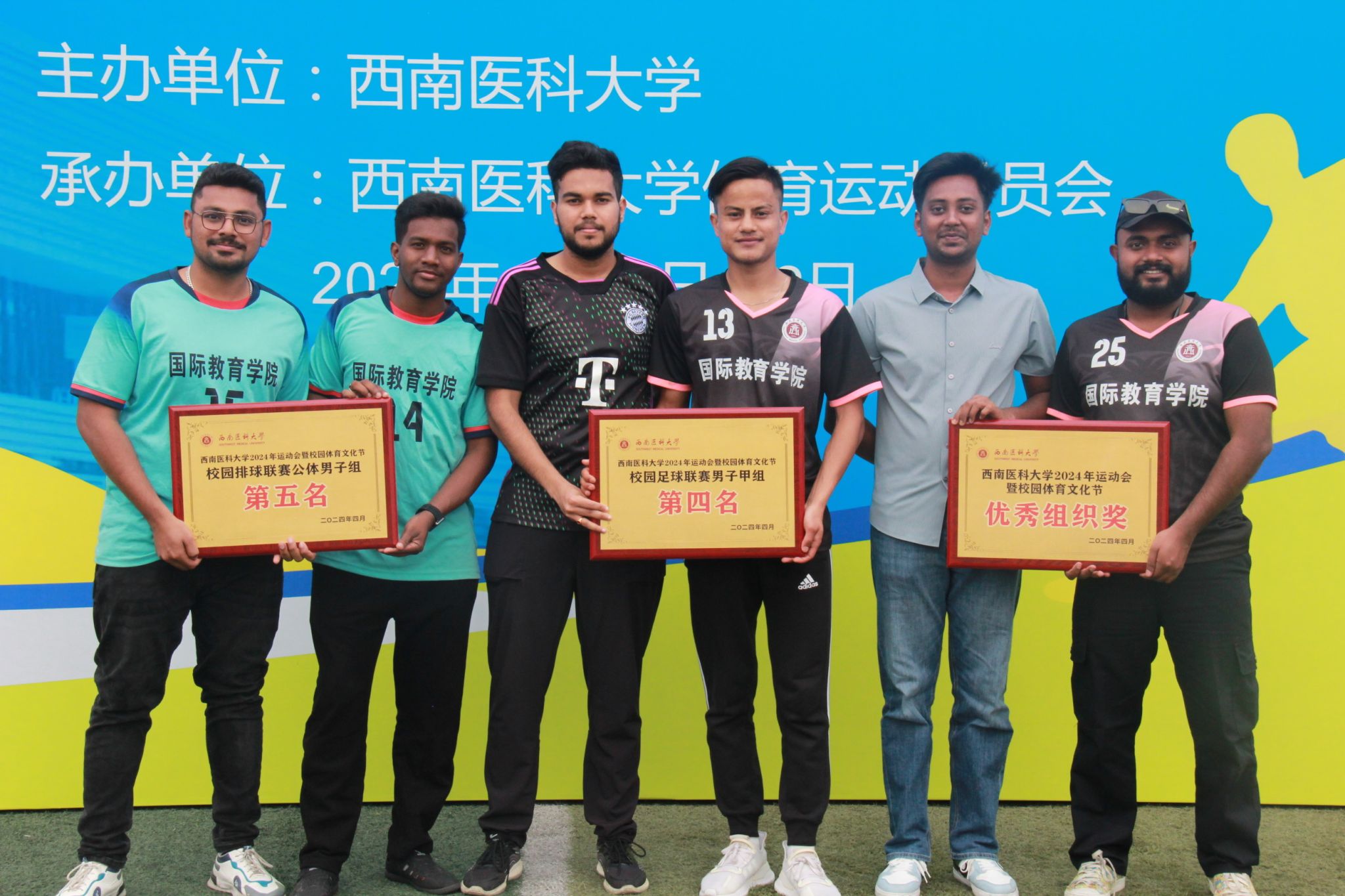 本届运动会国际教育学院派出留学生100余人分别参加足球、排球、乒乓球、羽毛球、田径等20余项比赛,获得足球联赛第四名、排球联赛第五名、20米持球接力跑第八名、男子铅球第二名的好成绩,3名运动员荣获学校“体育道德风尚奖”,国际教育学院荣获学校优秀组织奖。中外学生同场竞技,相互交流经验,用中文互相加油鼓劲,结下了深厚的友谊,享受运动的魅力。