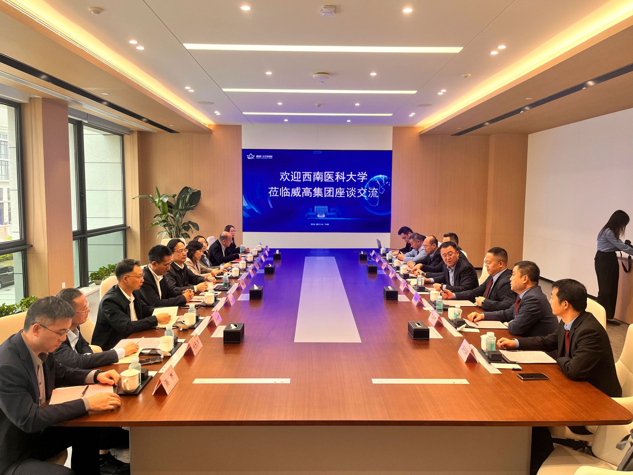 何涛及附属医院、附属中医医院相关负责人分别介绍了学校及医院发展情况与前期的合作成果。与会双方围绕深化校企合作、拓展科研平台共建、优化人才培养等深度研讨。