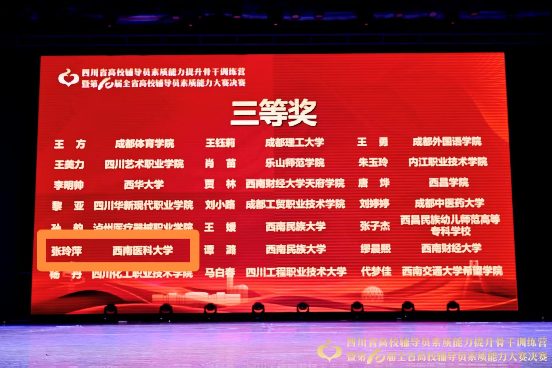 1114日至16日,由中共四川省委教育工委、四川省教育厅主办的四川省高校辅导员素质能力提升骨干训练营暨第十届全省高校辅导员素质能力大赛决赛在西华大学举行。来自全省125所高校的166名优秀辅导员开展激烈角逐,jdb电子儿科学系张玲萍荣获大赛三等奖,基础医学院杨笛荣获大赛优秀奖。