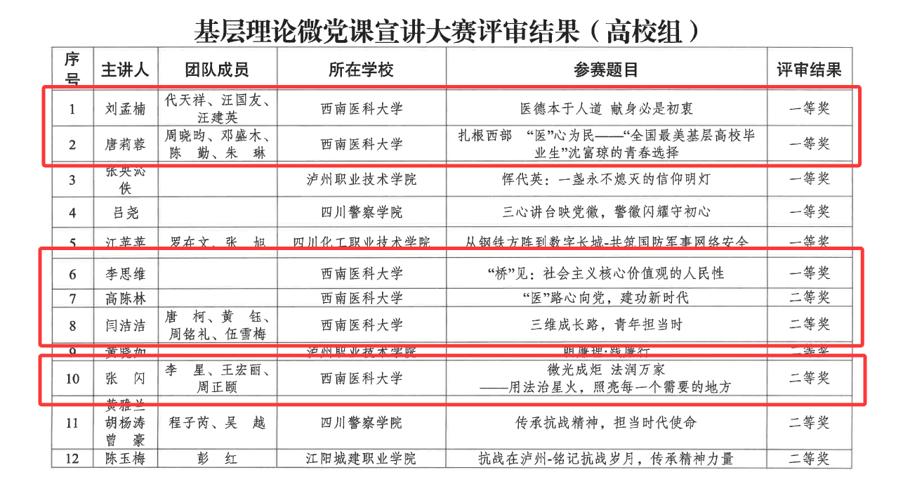 本次“酒城师说”基层理论微党课宣讲大赛旨在进一步落实立德树人根本任务,推进党的创新理论进校园、进课堂、进师生头脑,激励广大党员、干部真抓实干、奋勇向前。大赛评选出高校组一等奖6个、二等奖6个,jdb电子获奖数占高校组奖项总数50%,充分展现了西南医大人扎根教育医疗行业,奋发有为的精神面貌。下一步,学校党委将进一步创新党员教育载体,依托“微党课”“青年党员说”等,以小故事讲活大道理,让小讲台绽放大精彩,让党课走更走,教育引导广大党员满怀忠诚感恩之心、激发实干担当之志,推进党员教育走深走实、见行见效。