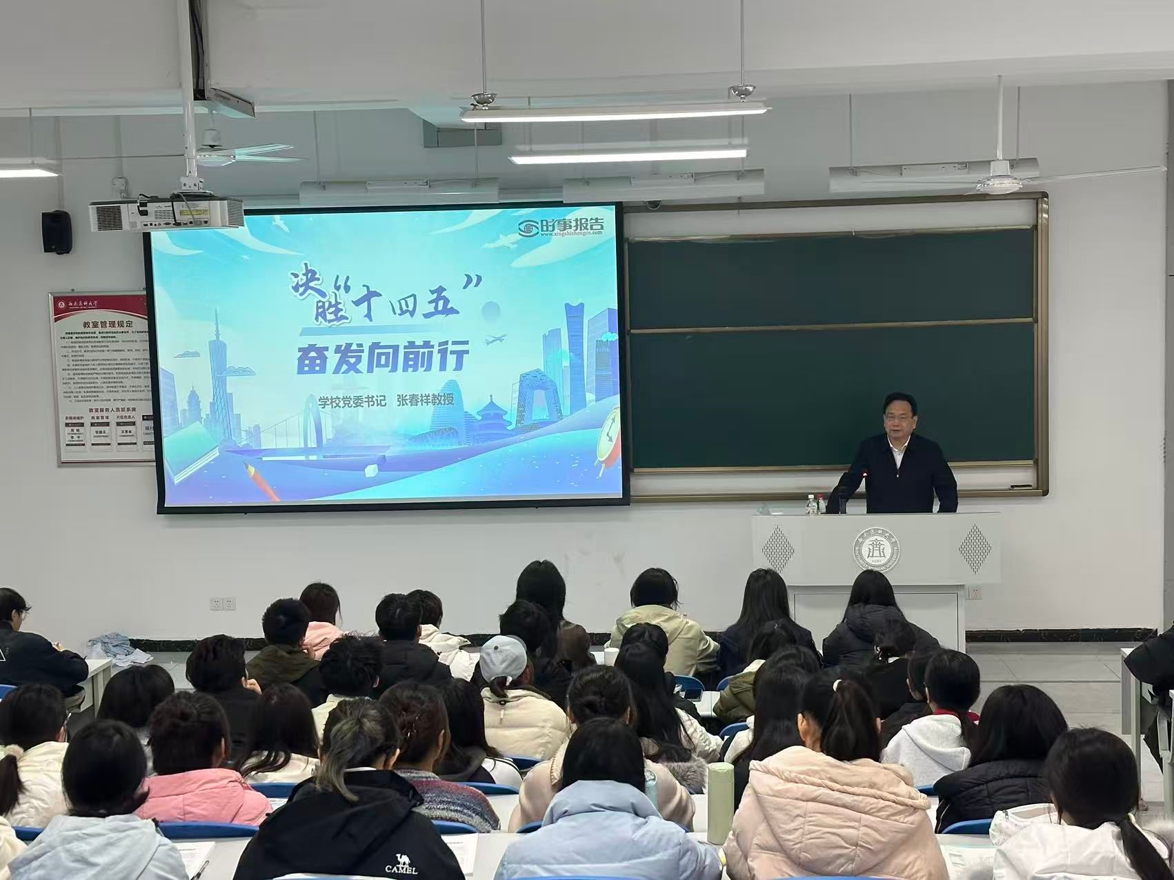 12月2日,学校党委书记张春祥走进“形势与政策”课堂,在城北校区学海楼503室,以《决胜“十四五”奋发向前行》为题,为2025级麻醉学专业学生带来了一堂立意高远、内涵丰富的思政课。