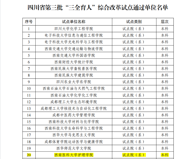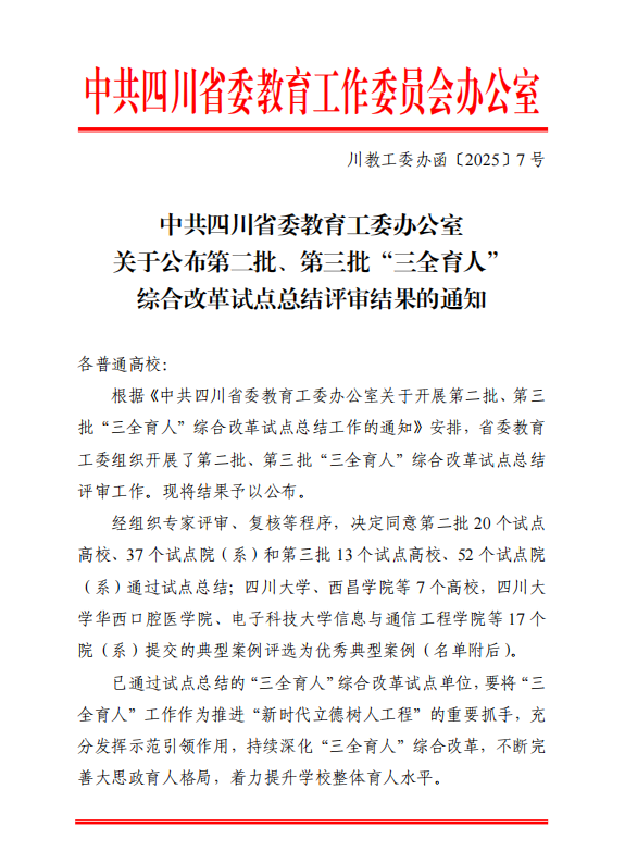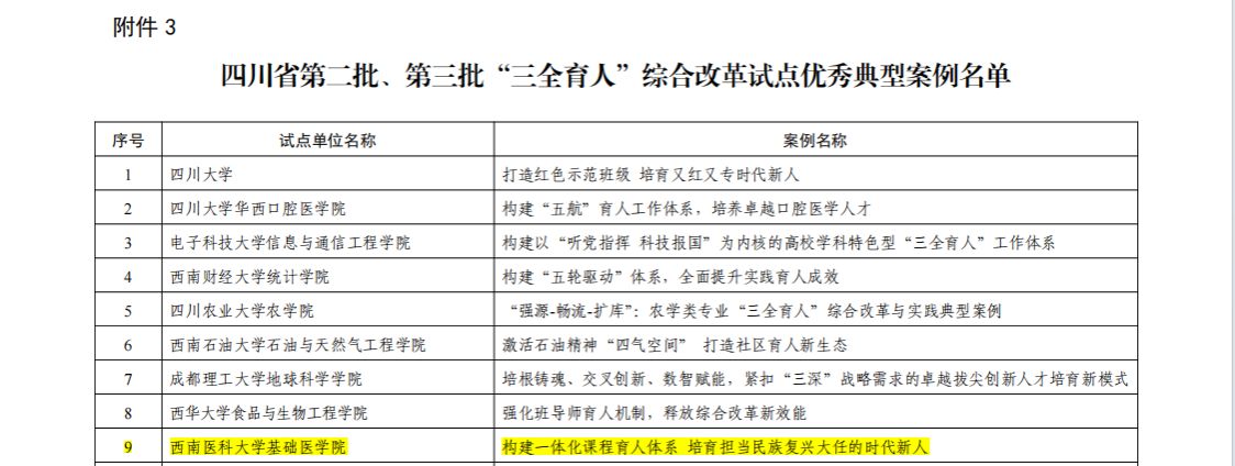 近日,中共四川省委教育工委办公室发布《关于公布第二批、第三批“三全育人”综合改革试点总结评审结果的通知》,经专家评审、复核等严格程序,jdb电子基础医学院、人文与管理学院、护理学院顺利通过“三全育人”综合改革试点院系验收。其中基础医学院典型案例《构建一体化课程育人体系培育担当民族复兴大任的时代新人》获评优秀。