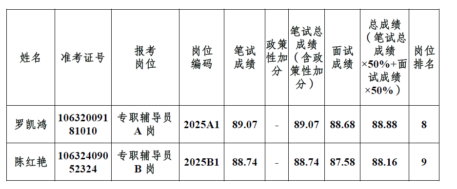 因本次公招报考岗位编码2025A1排名第五、岗位编码2025B1排名第二共2位考生自愿放弃,按公告要求,现递补符合条件报考岗位编码2025A1排名第八、岗位编码2025B1排名第九共2位考生进入体检环节,具体情况如下: