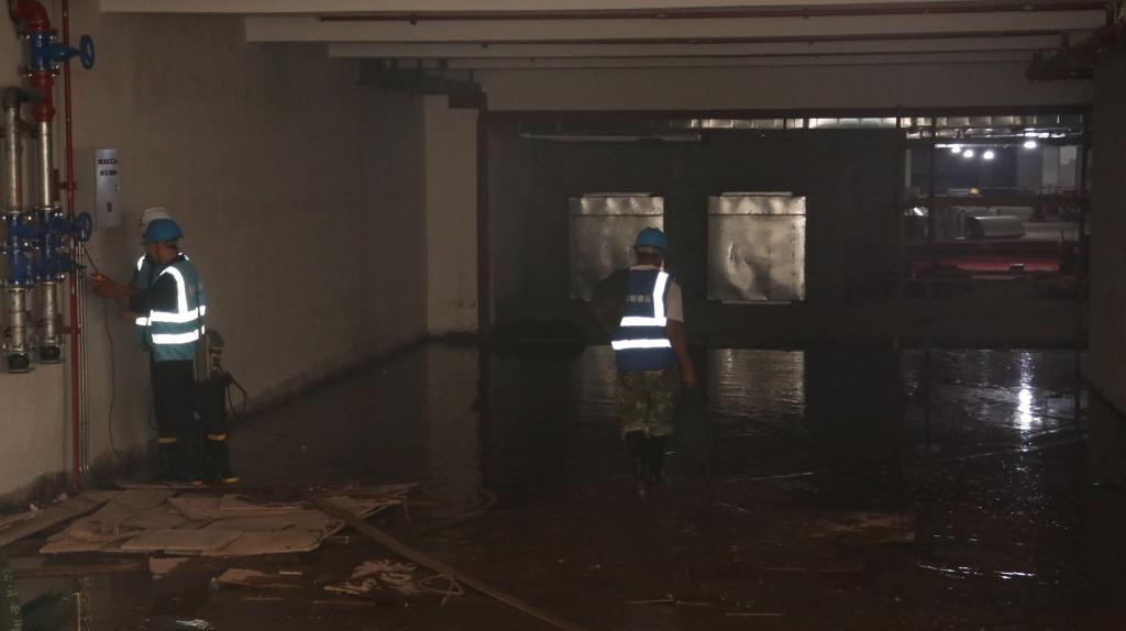 本次演练模拟施工现场连日遭遇强降雨,地下车库出现积水险情,即将淹没地下车库相关设备基础最高水位线,急需截水抢险,在抢险过程中一名工人受伤,现场救治。接到汛情通知后,指挥长立即下达命令,启动防汛应急救援预案,各应急小组紧急集合,应急抢险组率先响应,两人切断施工用电,其余人员运送防汛救援物资设备到位,并在治安疏散组对现场秩序的维护把控下,严密配合有序投入水泵、防汛沙袋等救援设备和物资, 迅速组织施工人员进行了抽除基坑积水和沙袋堵水作业,并转移重要设备,展开高效、有序的防汛应急抢险救援工作。疏散过程中有一名人员突发意外腿部扭伤,医疗救护组及时赶到进行急救处置,伤员得到有效救治。