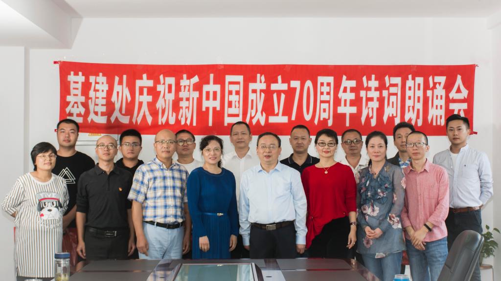 为积极响应全国推普周精神,全面贯彻国家语言文字方针政策,传承弘扬中华优秀传统文化,隆重庆祝中华人民共和国成立70周年,9月26日,基建处在德诚楼912开展庆祝新中国成立70周年诗词朗诵主题活动,教辅后勤党总书记陈家良、副书记吕春到场指导并全程参与。