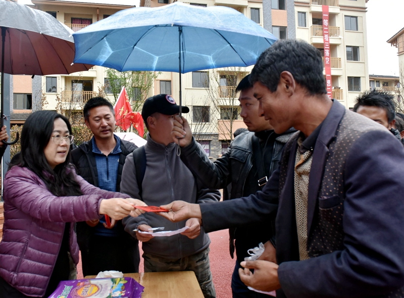“恭喜你们啊,今年分红了。”走访最后一站,廖斌一行来到昭觉县易地扶贫搬迁安置点,此时天空下着小雨,但依然挡不住村民的热情,他们整齐的排着队,等待着领取属于自己的集体分红基金。在当天的集体经济分红仪式上,44户贫困户,每户分得现金1500元。
