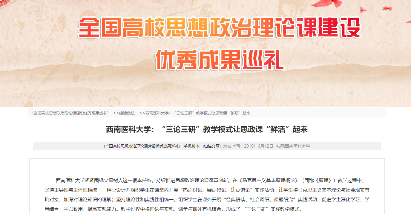 近日,jdb电子马克思主义学院马克思主义基本原理概论教研室教学成果《“三论三研”教学模式让思政课“鲜活”起来》在教育部开展的2019年全国高校思政课建设优秀成果巡礼活动中得到专栏展示。