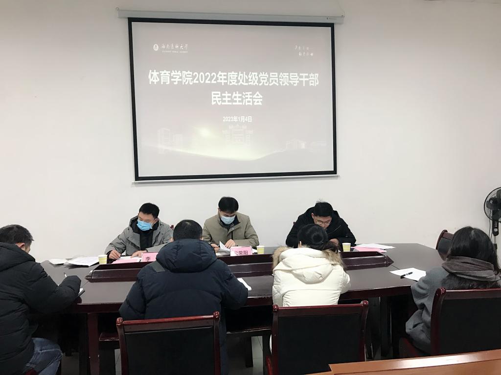 2023年1月4日上午,体育学院在学院会议室召开2022年度处级领导班子民主生活会,学校党委常委、副校长代荣阳,党委组织部副部长姚小东,学校纪委纪检监察室审查调查科科长李航到会指导督导,体育学院处级领导班子成员,党政办公室副主任参加会议。党总支书记邹小萍主持会议。