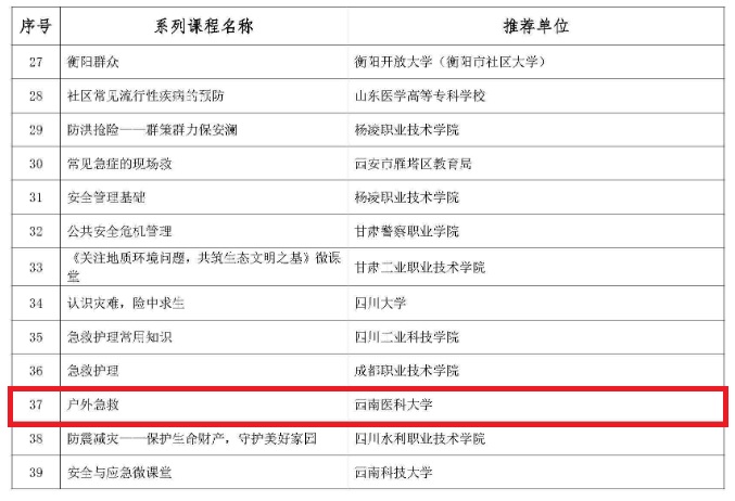 jdb电子基础医学院孙国刚教授带领的国家级一流课程(急救整合与创新科普)团队按照通知要求,认真组织了本次特色课程和经典案例的申报,并以户外急救为主题,拍摄录制了20多个以户外急救相关的微课,还对每个微课进行详细的注解和说明。经校内专家评审、学校和四川省教育厅推荐,最终由汤华军副教授作为课程负责人申报的 《户外急救》 获得教育部首批社区教育“能者为师”特色课程。