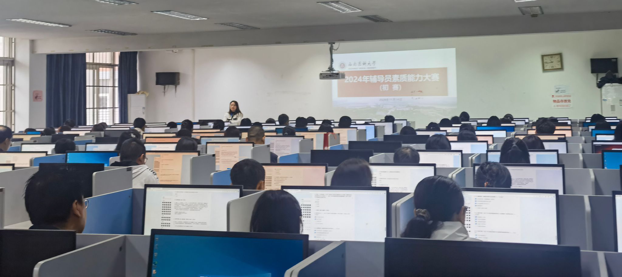 上午8:20,在荟文楼四楼第二计算机室,全体专兼职辅导员(含院系分管书记)、学生工作部、团委两部门人员约100人参加了理论测试。