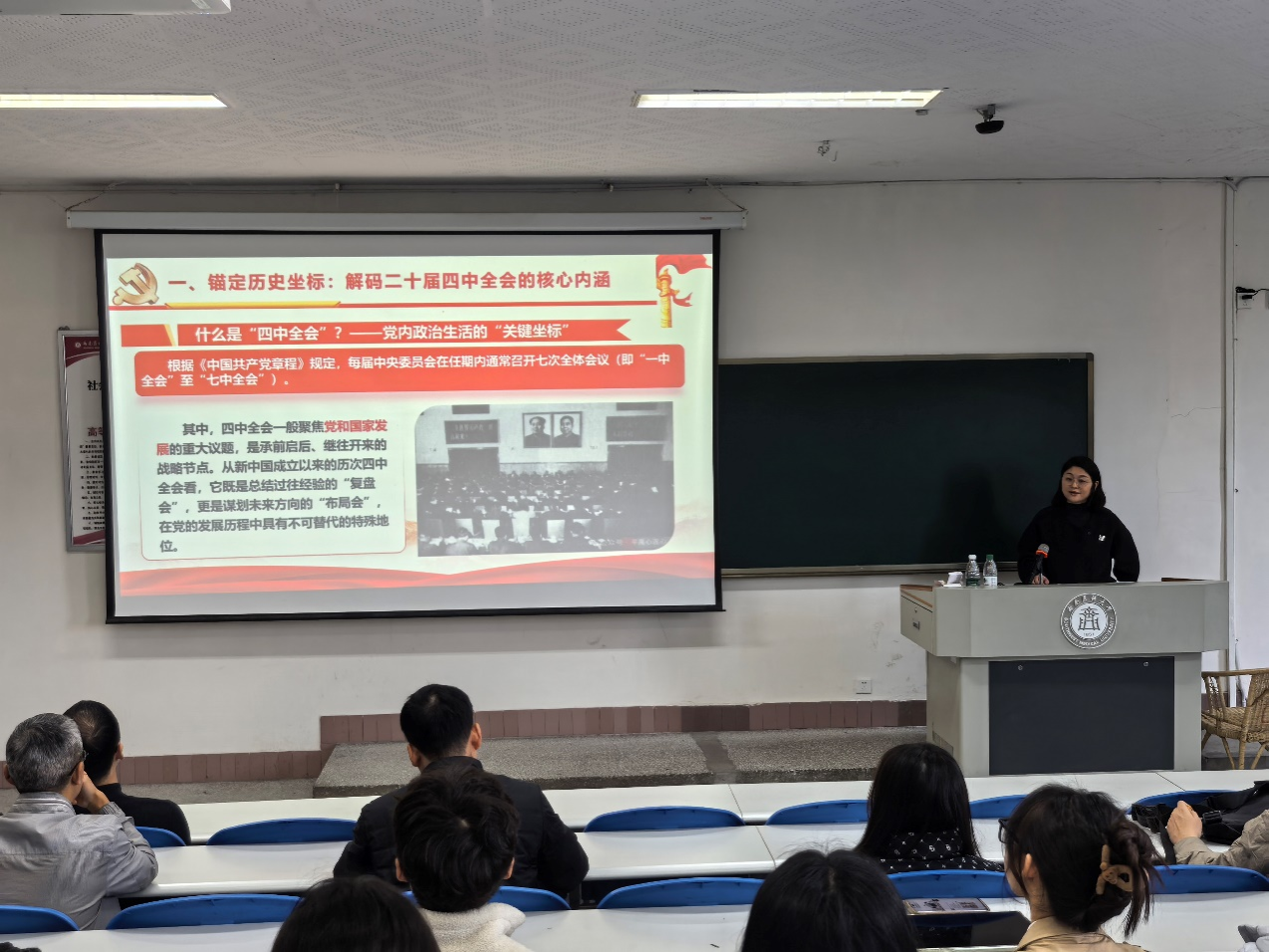 活动中,医学检验系党总支书记裴傲秋以《深学笃行二十届四中全会精神,勇担“十五五”现代化新使命》为题,为全体党员上专题党课。党课围绕党的二十届四中全会核心要义、总书记为何高度重视“十五五”规划编制、“十四五”时期发展成效、人民日报新华社的重磅文章传递的核心信号、以及全会擘画的未来发展蓝图等关键方面展开详细阐述,带领大家原原本本学原文、逐字逐句悟原理,推动全会精神入脑入心。