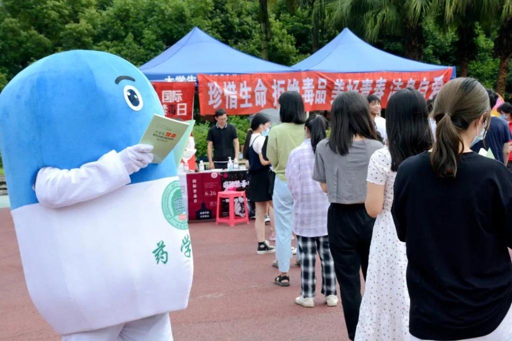 药学院“吉祥物”为同学们分发禁毒防艾知识读本