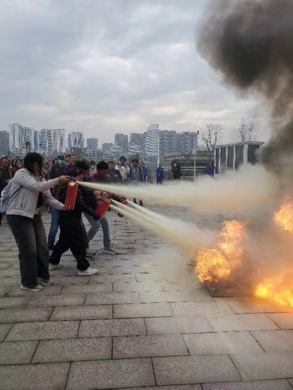 疏散逃生演练结束后,保卫处组织参加演练人员在弘润楼前进行了油盆灭火演练。通过实际操作,师生员工掌握了初火现场的处置方式,进一步提升了扑救初起火灾的能力。