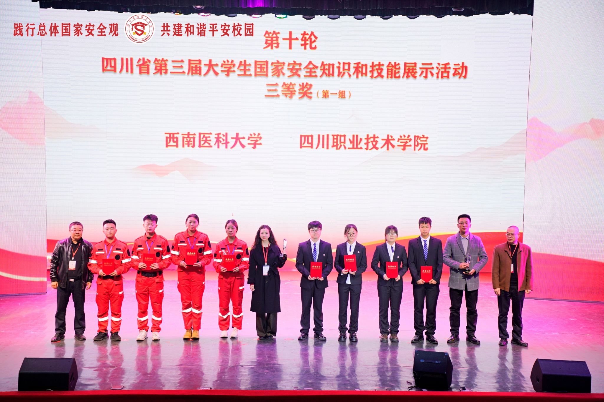 近日,由四川省教育厅、公安厅、国安厅指导,四川省高等教育学会高校保卫学专业委员会主办,西华师范大学承办的四川省第三届大学生国家安全知识和技能展示活动在南充举行。经过激烈角逐,jdb电子由保卫处副处长俞扬君担任领队、治安科副科长廖磊担任指导教师,药学院2022级罗秋月、体育学院2023级阮中正、公共卫生学院2022级吴建锡和张洋等4名学生组成的学校代表队最终获得本次比赛三等奖。